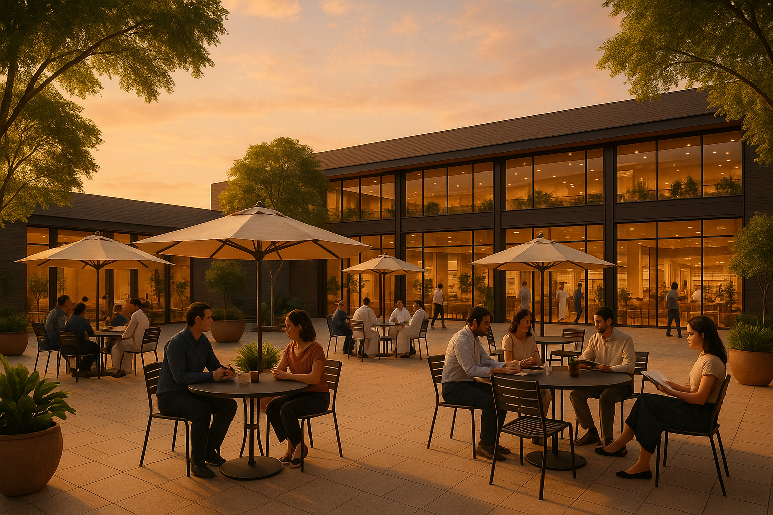 Soft organic forms, clean architectural lines, and the interplay of light and shade contribute to a vibrant, human-centric environment. Water features and native landscaping were thoughtfully positioned to provide cooling, comfort, and aesthetic delight. The material palette includes natural stone, wood accents, and open structural elements, reinforcing a sense of lightness and regional sophistication.