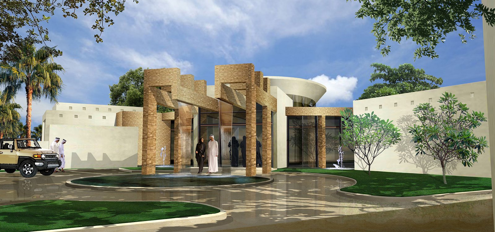 The entrance sequence is defined by a grand colonnaded water feature, setting a serene tone as guests transition into the welcoming majlis interior. The landscaping is both intentional and lush, with manicured lawns, indigenous trees, and reflective pools that soften the strong architectural geometry and provide a cooling microclimate. The internal spatial layout is designed to offer both formality and intimacy, ideal for hosting distinguished guests and business gatherings in a setting that emphasizes discretion and comfort.