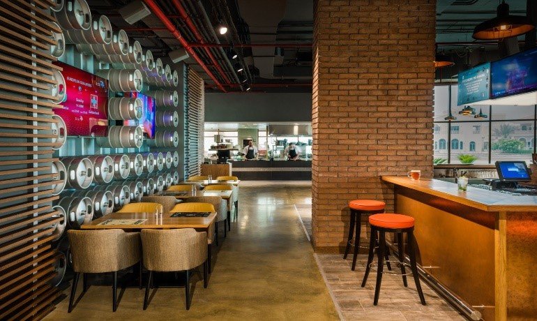 Drawing inspiration from classic American sports pubs and industrial lofts, the interior was designed to be warm, tactile, and dynamic. Exposed steel beams, reclaimed timber accents, subway tiles, and concrete floors establish a rugged authenticity, while a curated mix of sports memorabilia, vintage lighting fixtures, and high-definition screens ensure a fully immersive fan experience.