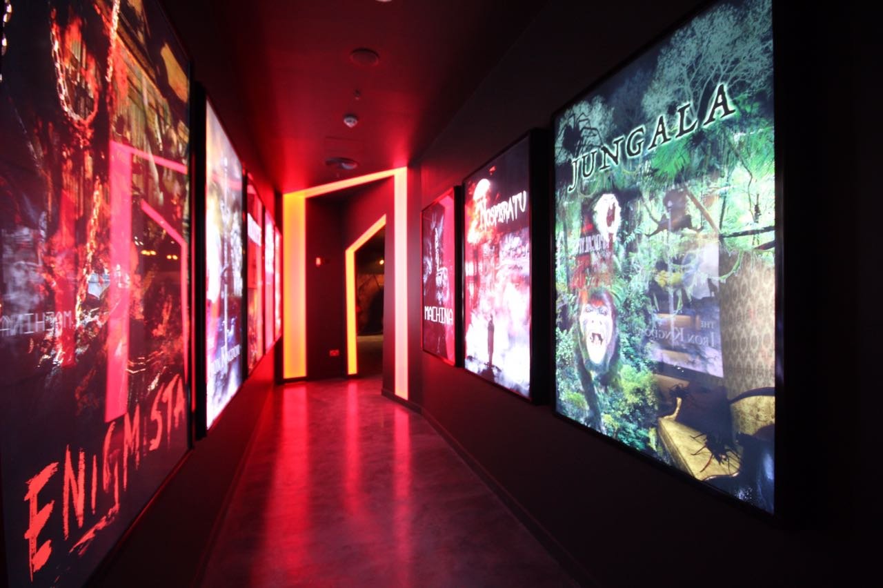 The lobby and waiting areas were conceived as transitional portals, combining dark hues, textured surfaces, and minimalist graphic elements to prepare visitors for their journey. Functional considerations such as team briefings, bookings, and guest circulation were seamlessly integrated into the aesthetic, ensuring that both operational efficiency and dramatic tension coexisted effortlessly.