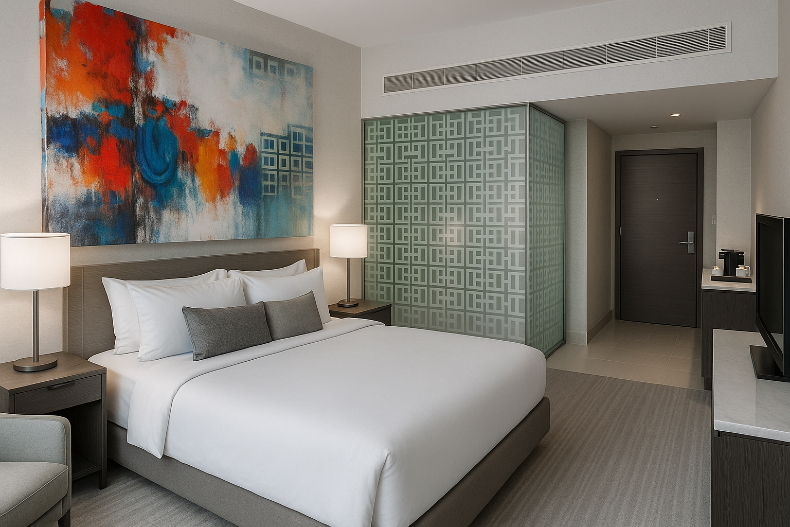 Each of the 218 guest rooms and suites is designed with a focus on spatial clarity, natural light, and modern Arabian luxury. Custom furnishings, textured wall treatments, and locally inspired design motifs celebrate the region’s heritage while delivering world-class comfort.