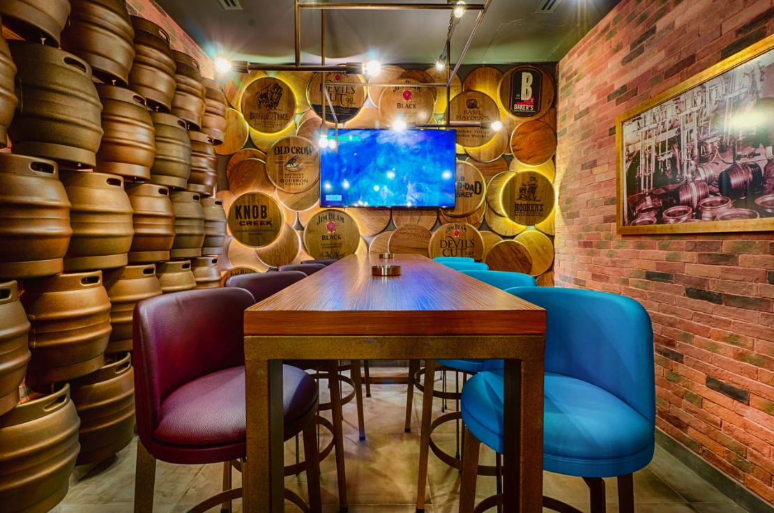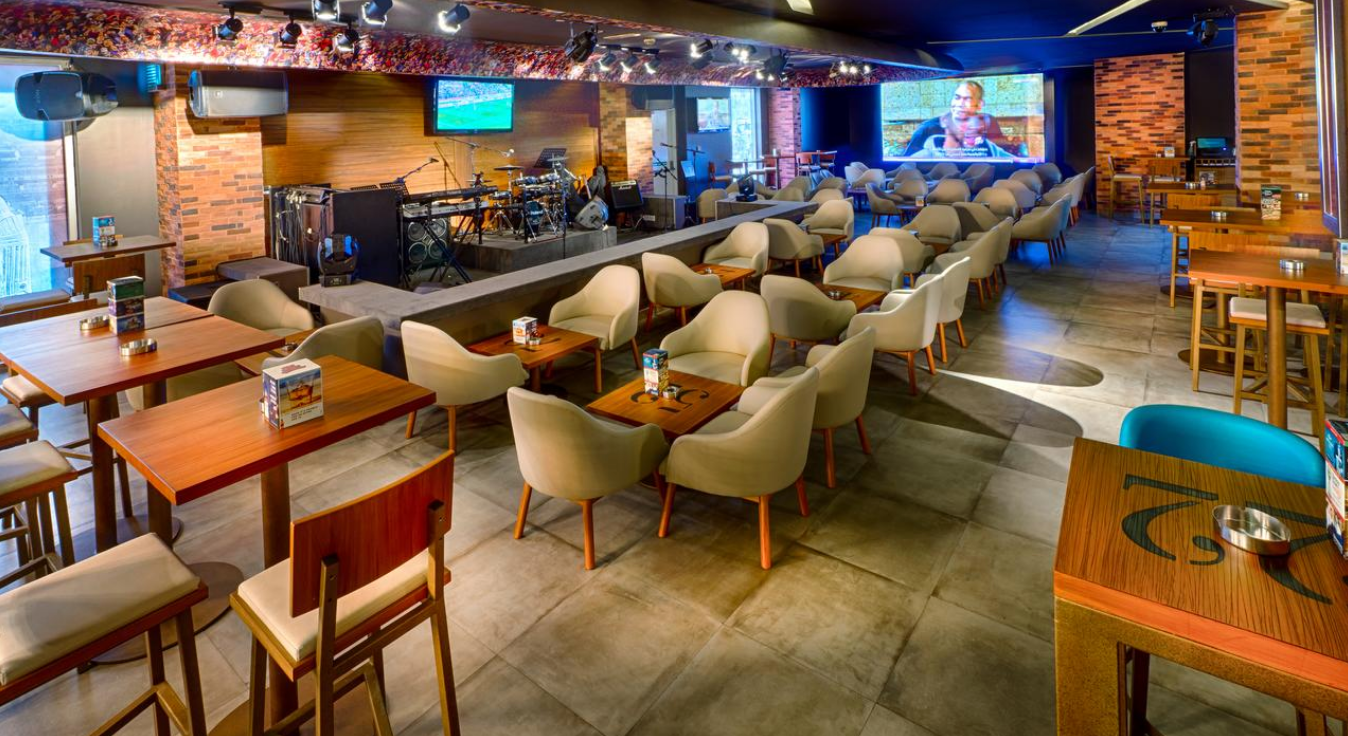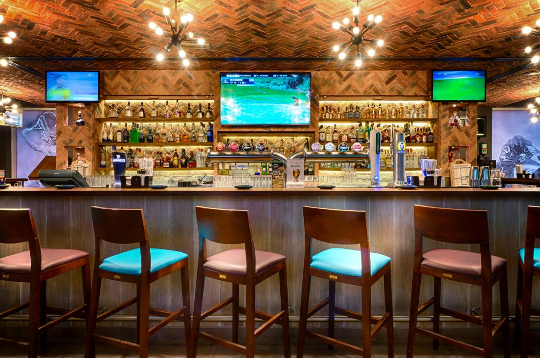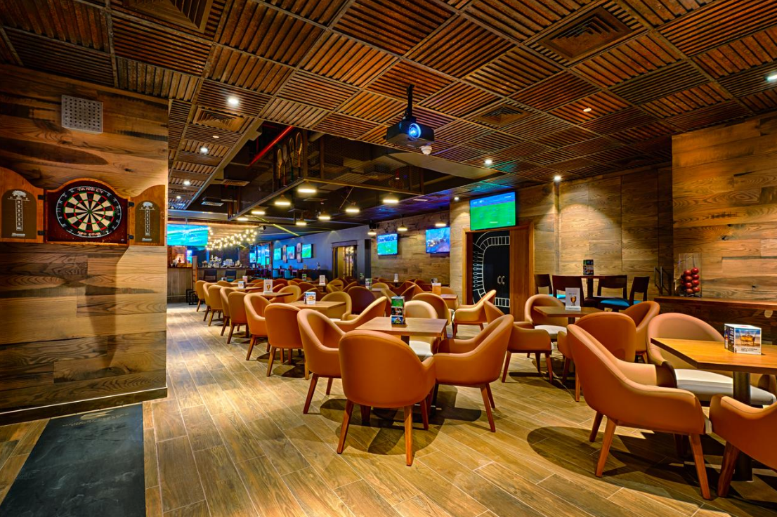 The furnishings blend comfort and durability: upholstered lounge chairs are paired with high tables and bar stools to create a variety of social settings. Sports memorabilia and dynamic wall graphics complement the multiple flat-screen displays strategically placed to ensure uninterrupted sightlines to every major match. Acoustic planning, lighting balance, and crowd flow were all carefully studied to support live music nights and game-day cheering alike.