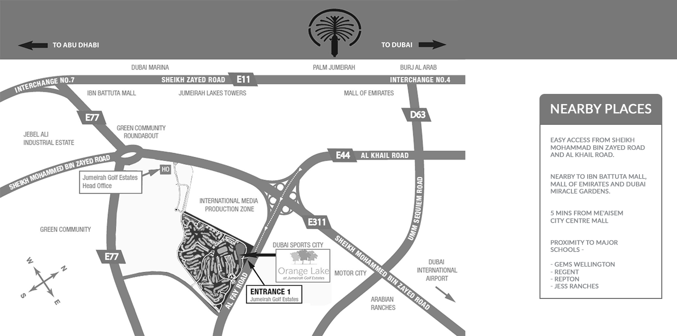 Nestled within the lush green surroundings of two championship golf courses, Orange Lake is supported by a vibrant community infrastructure, including jogging trails, children’s parks, tennis courts, and a private Country Club with a spa, gym, and dining venues. With close proximity to Dubai’s top schools, Ibn Battuta Mall, and Mall of the Emirates, Orange Lake offers a lifestyle of seclusion, sophistication, and everyday convenience.