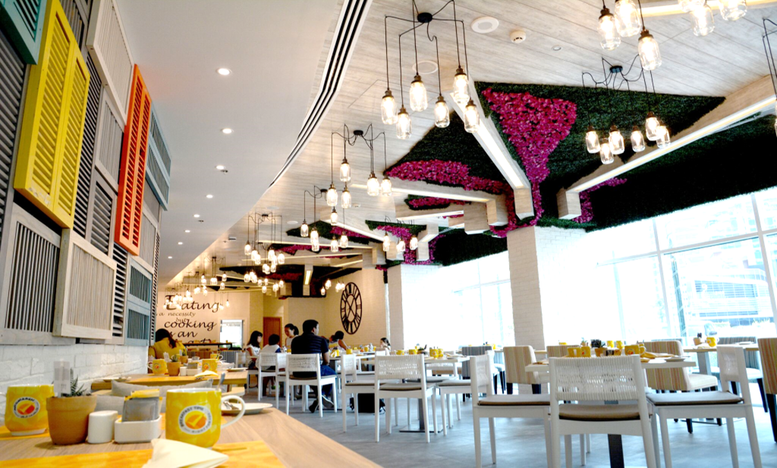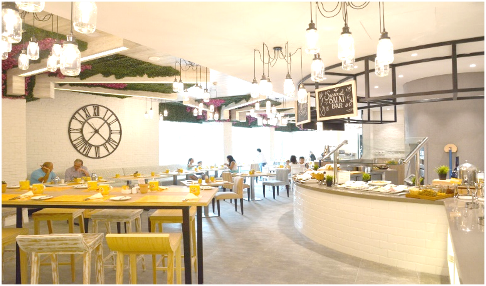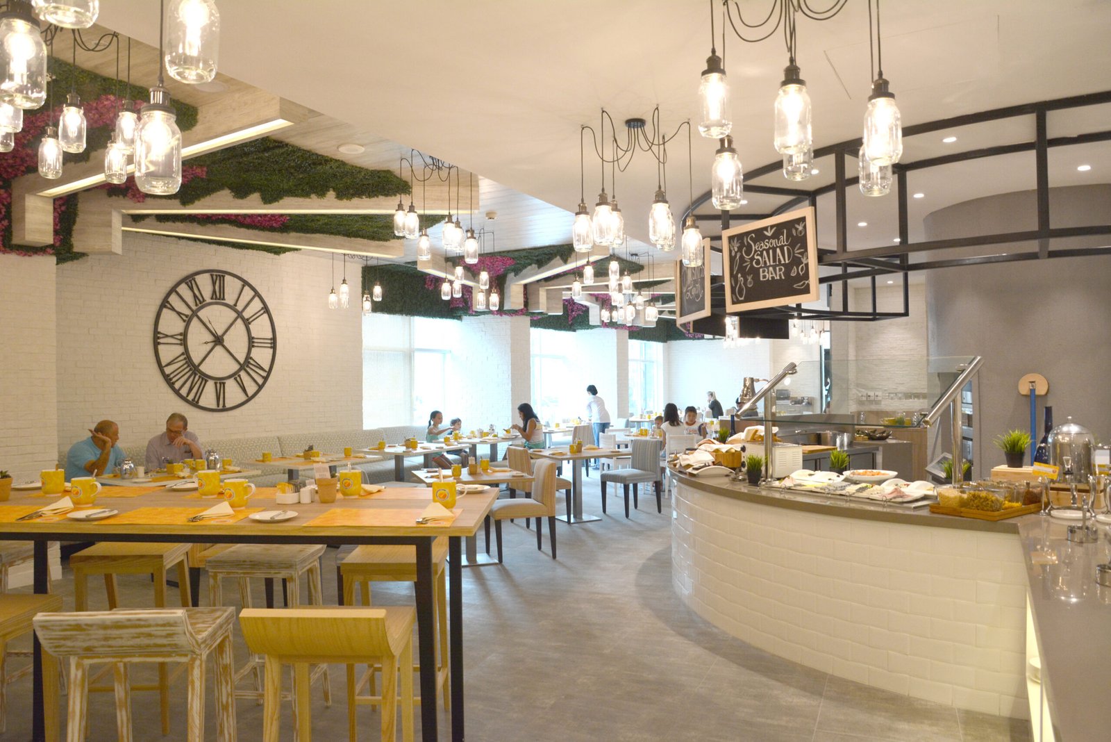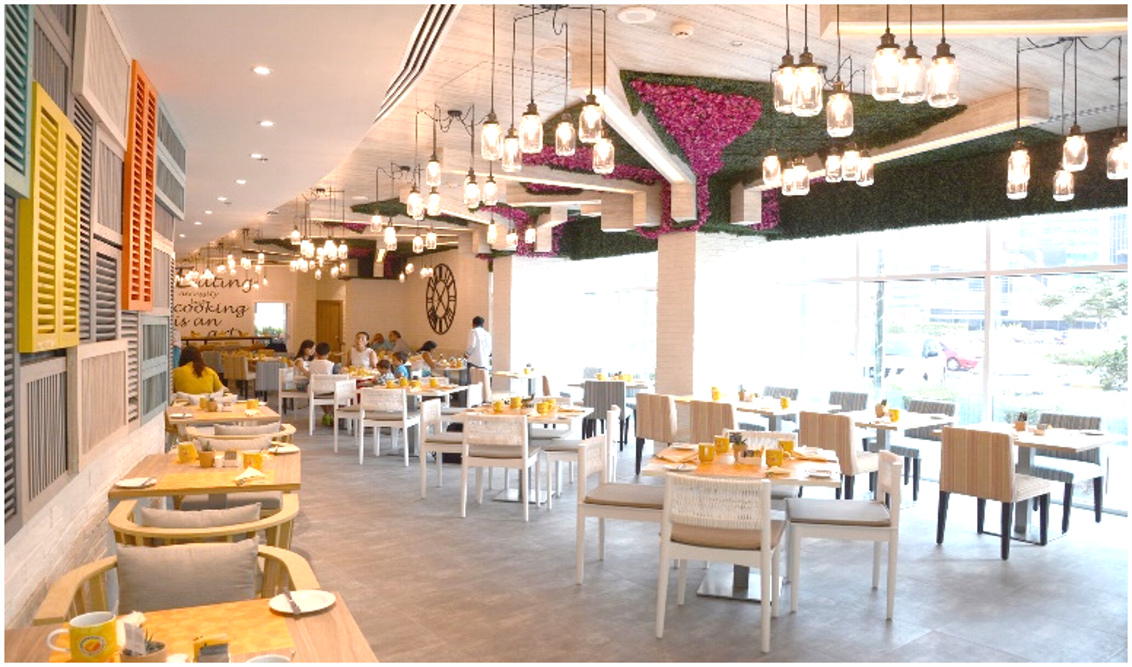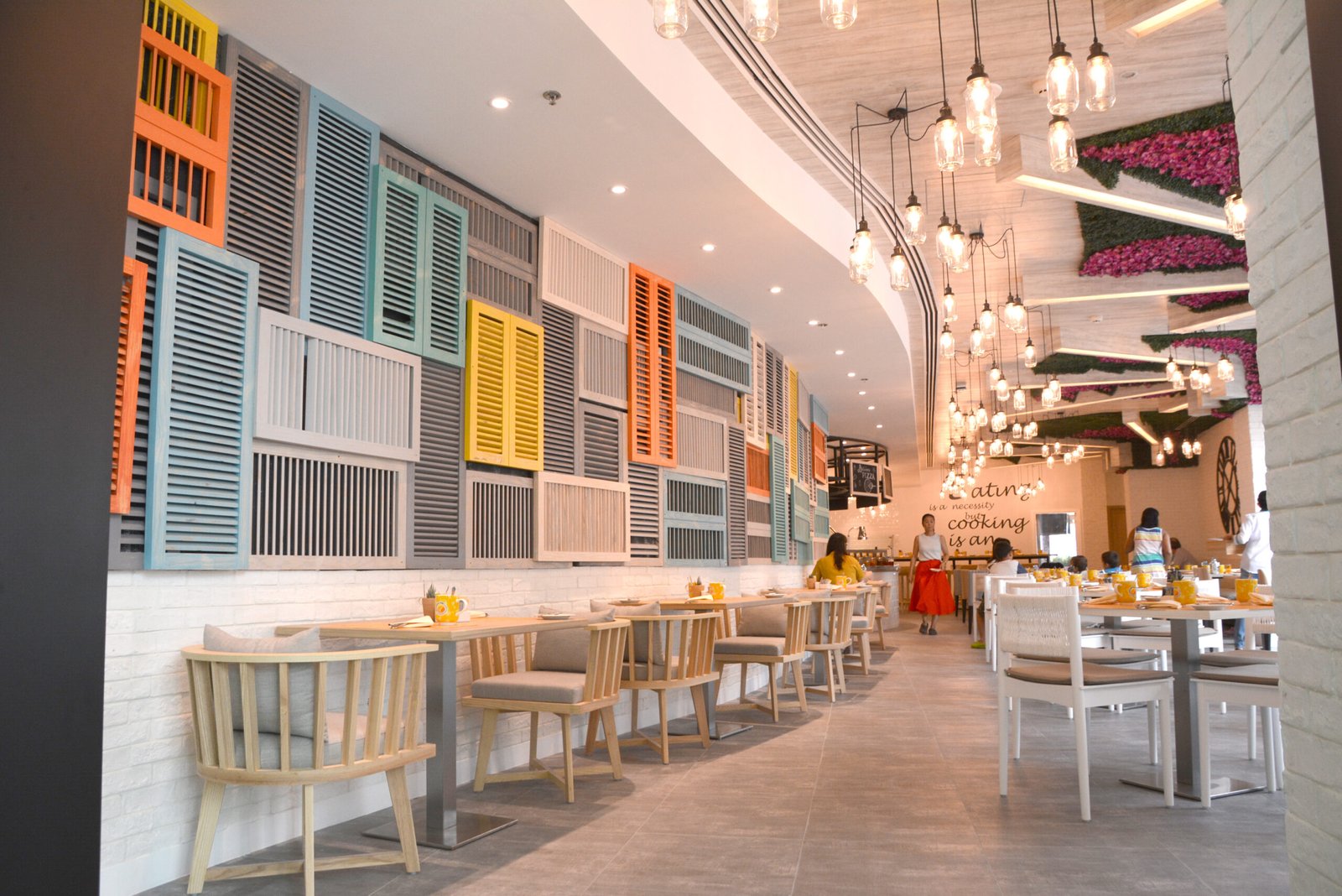 The eatery’s aesthetic language is reinforced by a textural play of timber shutters in muted Mediterranean colors adorning the feature walls, referencing traditional façades of southern European towns. Light floods the interior through expansive windows, with leafy green accents and hanging planters adding biophilic relief. An eclectic blend of seating options, including communal tables and intimate booths, ensures the space caters to both casual diners and private events. This layout flexibility was integral to the brief, given the requirement to host small events and curated gatherings within the space.