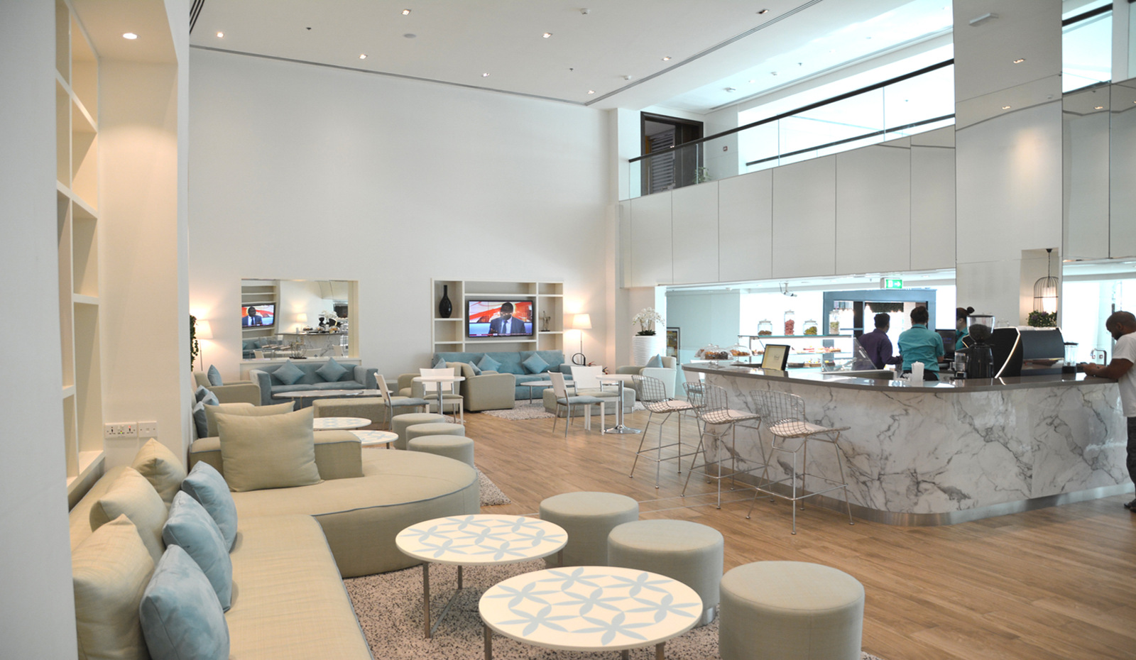 Pranzo Eatery represents a refined hospitality design concept that seamlessly marries modern Mediterranean ambiance with the spirit of communal dining. Located in the heart of Dubai, the design narrative draws upon the warmth of coastal cultures through a mix of natural textures, layered lighting, and subtle visual nods to the region’s vernacular architecture. Upon entry, guests are greeted by a multi-tiered open-plan layout defined by elegant white surfaces, light wood tones, and vibrant accent elements. A statement clock, rendered in mirrored glass and Roman numerals, anchors the transition between the lobby and the eatery, functioning both as a sculptural element and a symbolic gesture that reflects the timelessness of Mediterranean culinary traditions.
