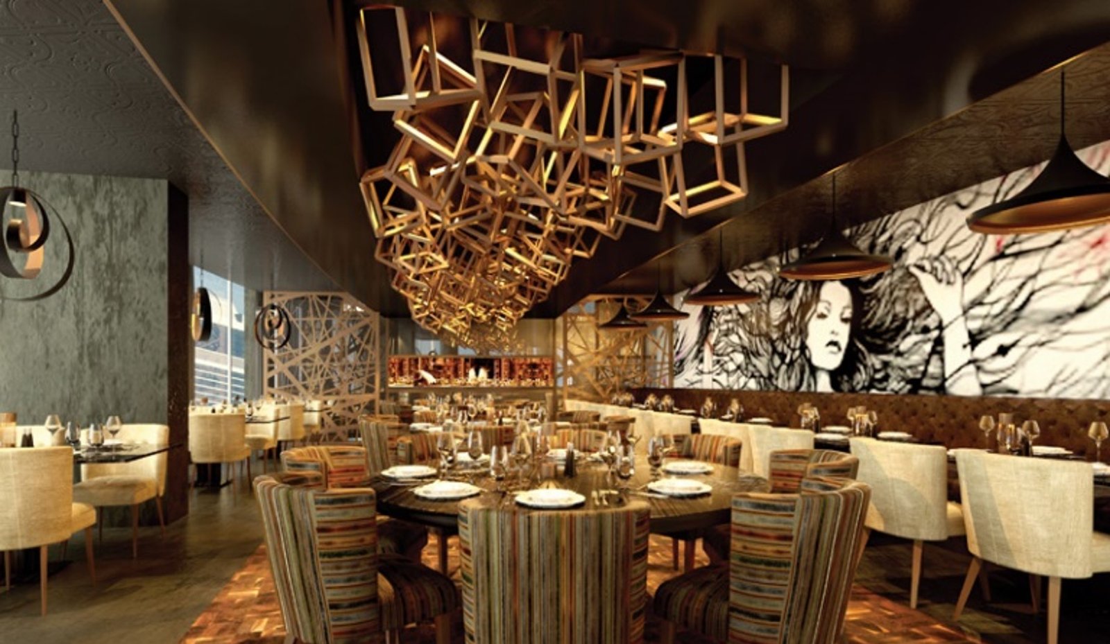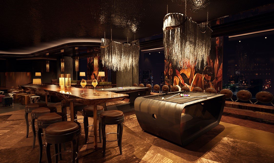 Bespoke chandeliers and geometrically patterned partitions act as sculptural focal points, enhancing the drama of the interiors while preserving visibility across the expansive space. A pool table zone, recessed subtly into the layout, maintains the equilibrium between leisure and social engagement. The thoughtful spatial sequencing ensures fluid transitions between dining, lounging, and dancing—all orchestrated under a ceiling that dances with indirect light.