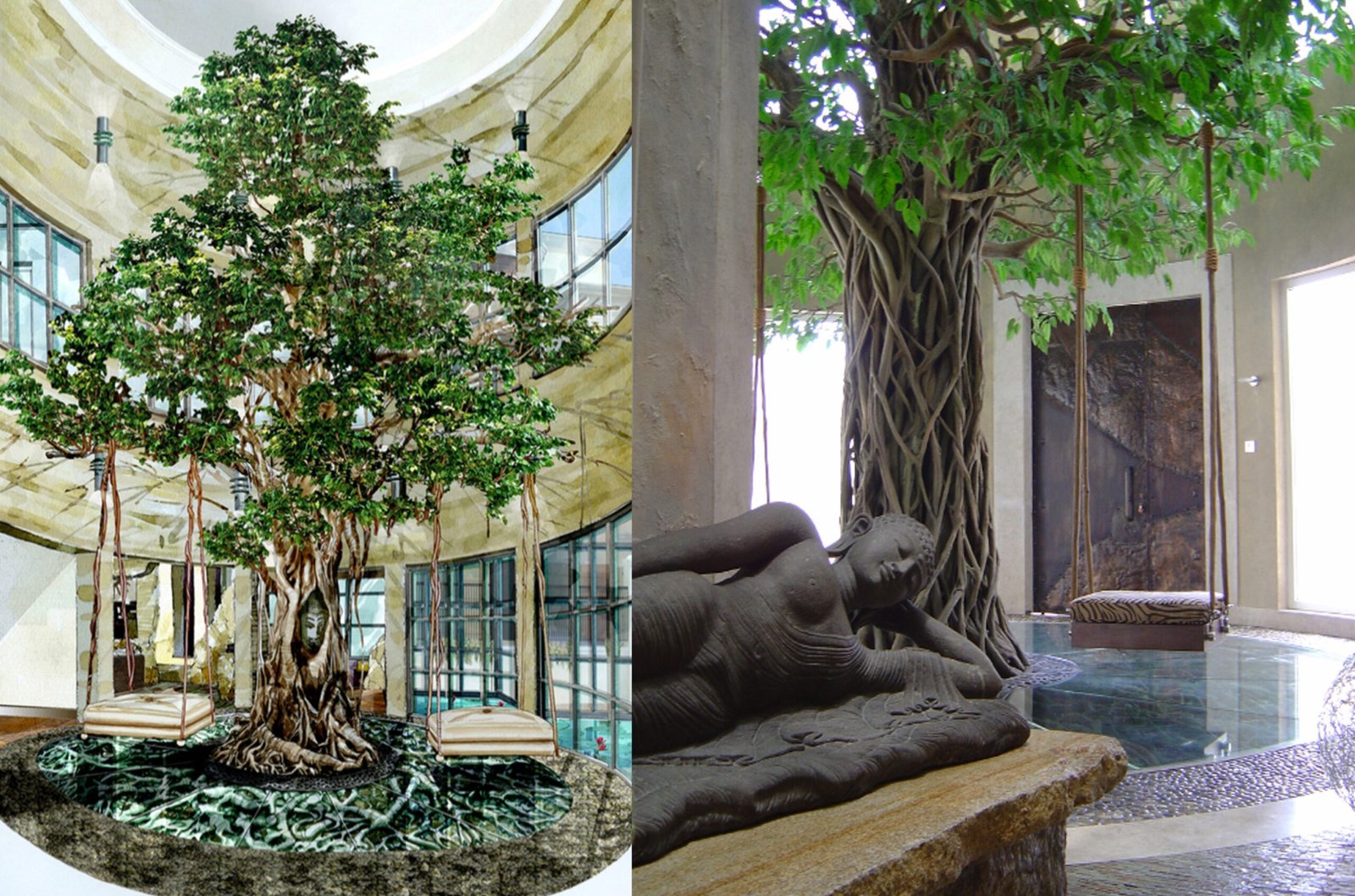 The villa houses multiple formal and informal lounges, including a dining room fitted with a handcrafted solid wood table and geometrically patterned chairs, accented by a golden ambient lighting feature. A wellness wing features a spa-style indoor pool surrounded by natural stone and custom-built swings beneath a stylized Banyan tree sculpture, invoking serenity and grounding energy.