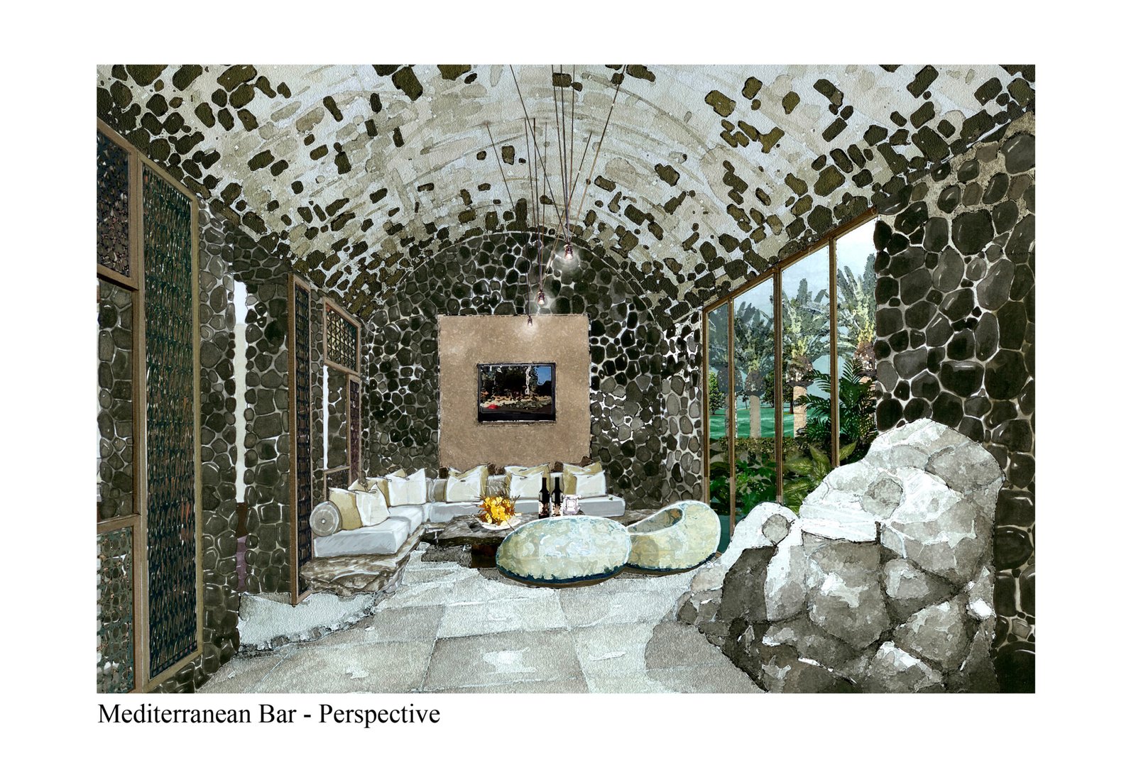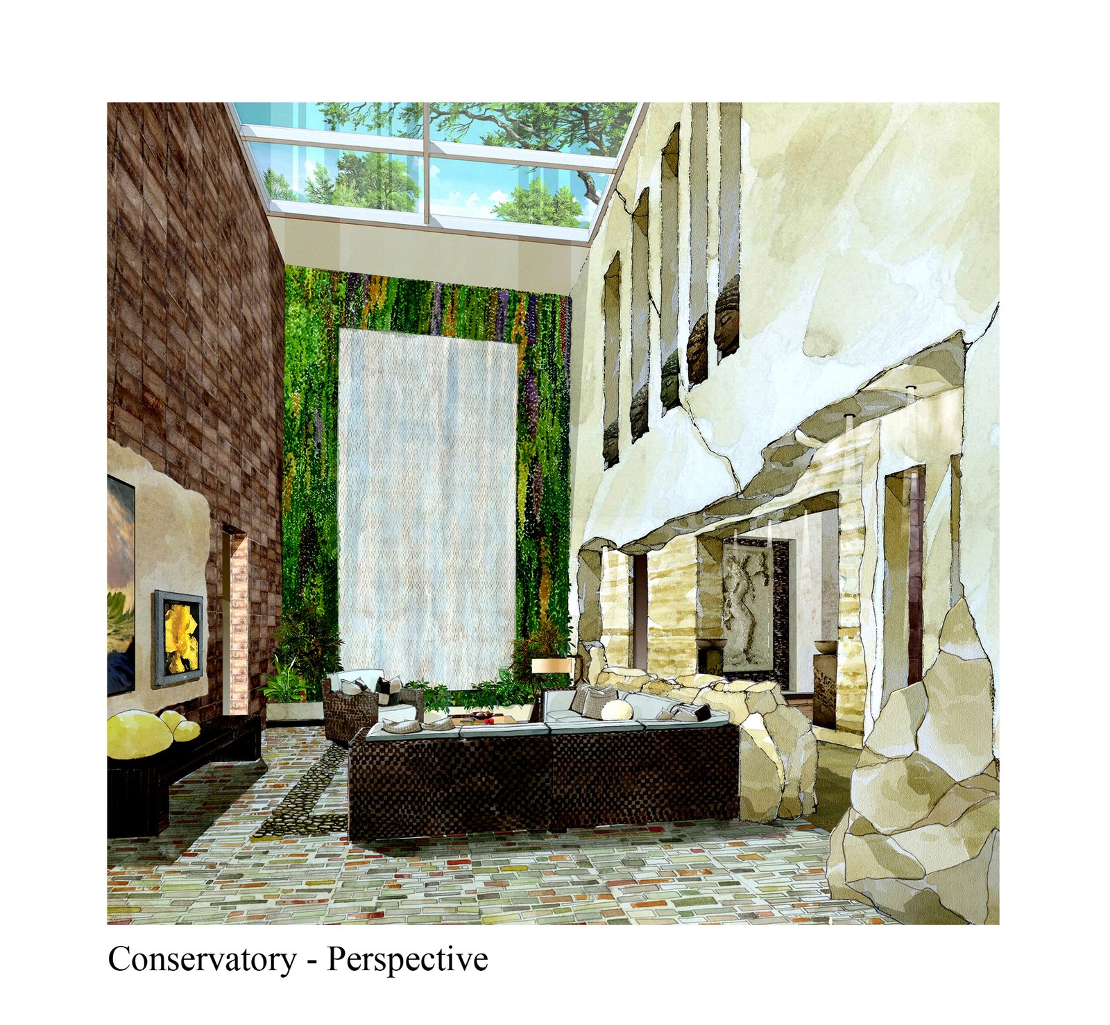The interior design blends classical Middle Eastern motifs with modern sophistication. Upon entry, the reception areas are adorned with custom stone inlay flooring, dramatic textured walls, and sculptural lighting. A grand conservatory draws inspiration from biophilic design, with a full-height vertical garden and skylight above, allowing greenery to cascade alongside a stone waterfall feature, establishing a contemplative core to the home.