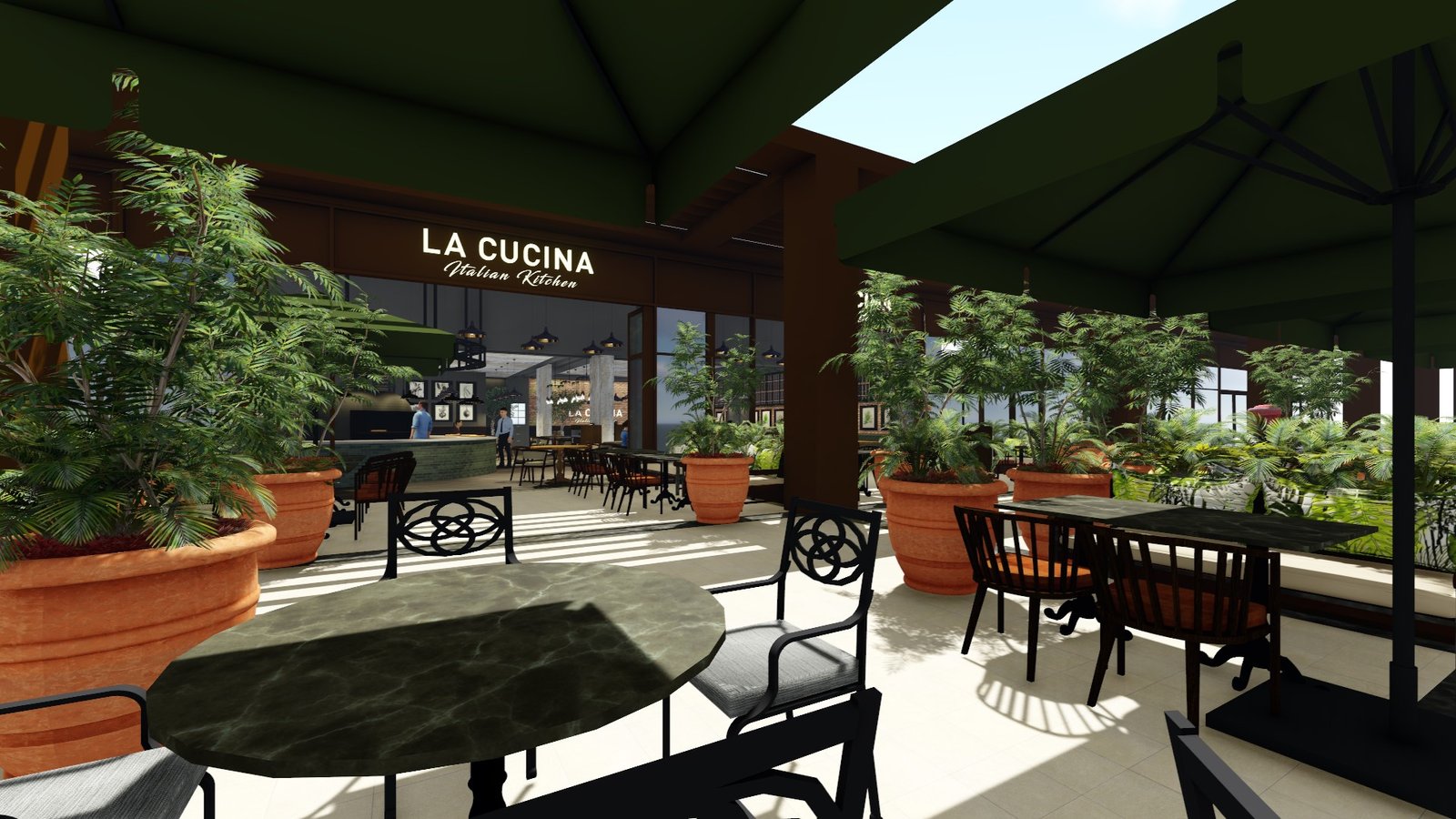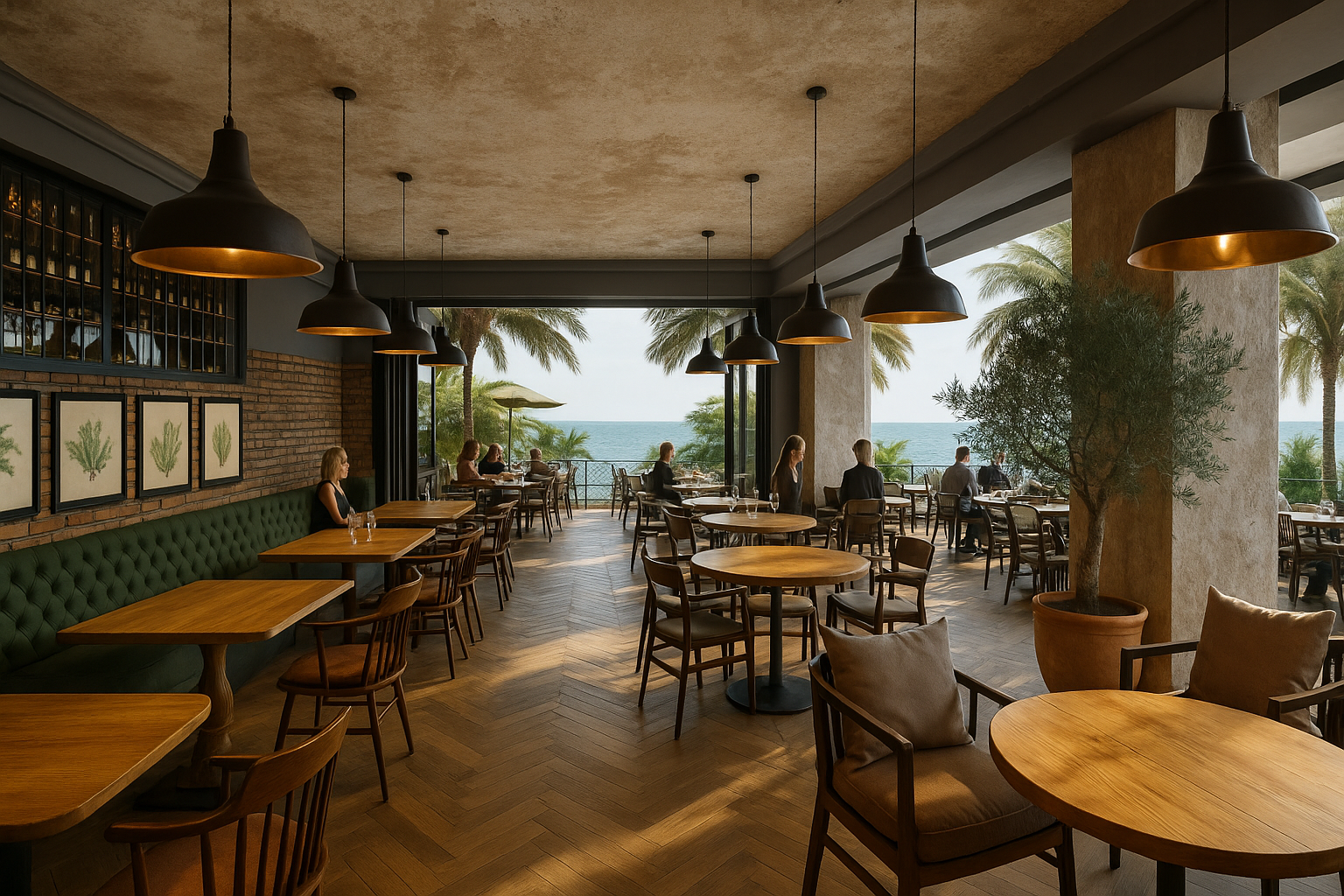 Vapiano’s layout encourages flexibility and fluidity—ranging from cozy café-style seating and long communal tables to casual lounge areas and private nooks. A large portion of the dining area seamlessly opens out onto an expansive outdoor terrace, shaded by olive trees and rich Mediterranean foliage, with sweeping views of the Arabian Gulf. This terrace offers an idyllic alfresco setting perfect for leisurely lunches, sunset dinners, or laid-back gatherings under Dubai’s starry skies.