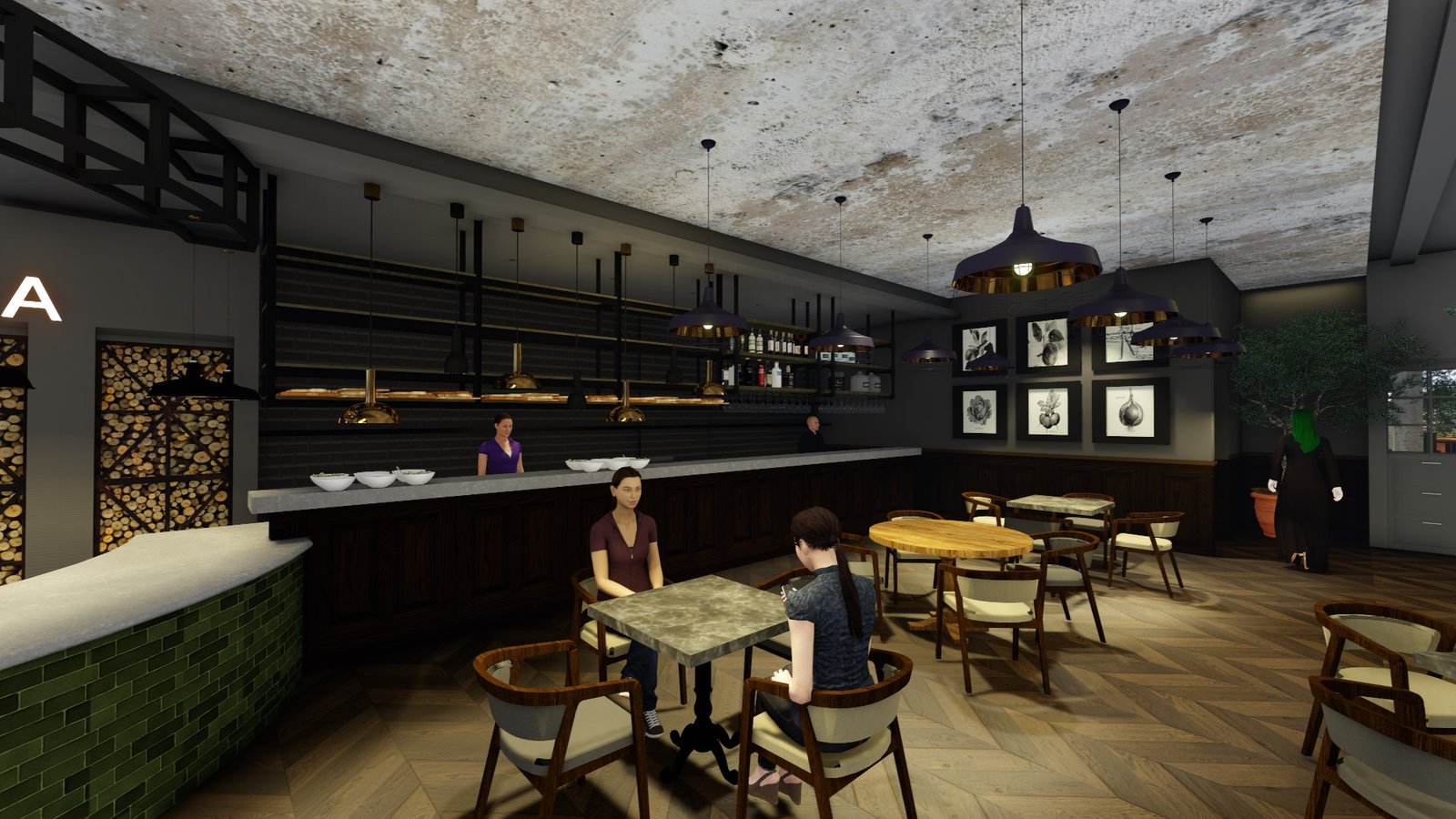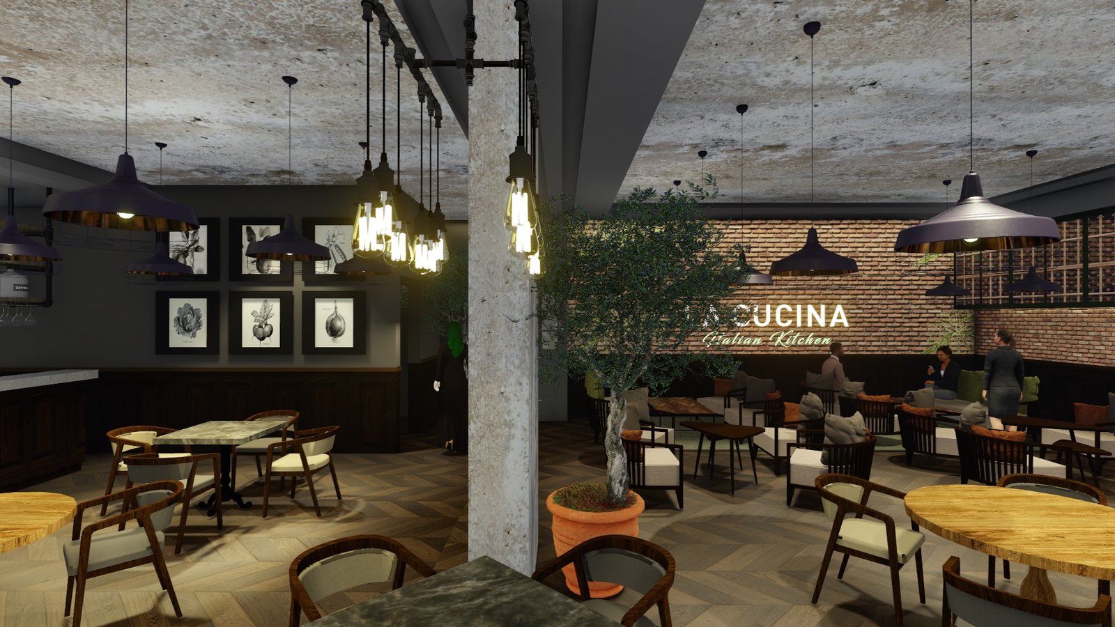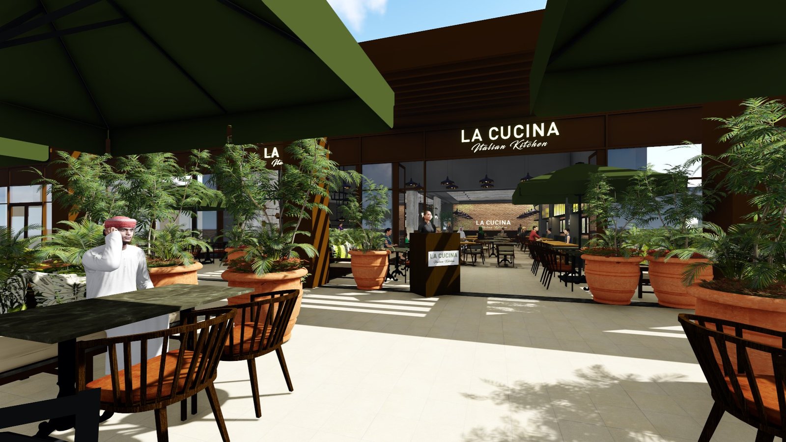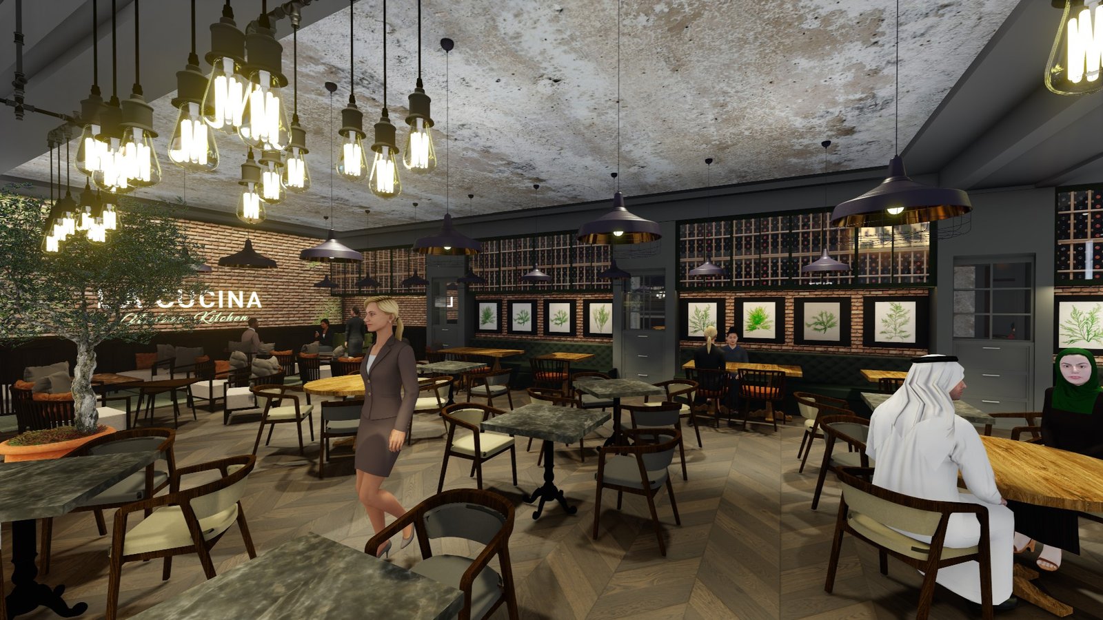 The interiors are enhanced by layered pendant lighting, a curated wall of Italian botanical prints, and wine racks integrated as architectural features, nodding to both Italian culture and Dubai’s cosmopolitan lifestyle. Comfort meets style throughout the space, with soft upholstered seating, deep green and navy hues, and textural contrasts designed to complement the restaurant’s fresh, approachable, and premium culinary ethos.