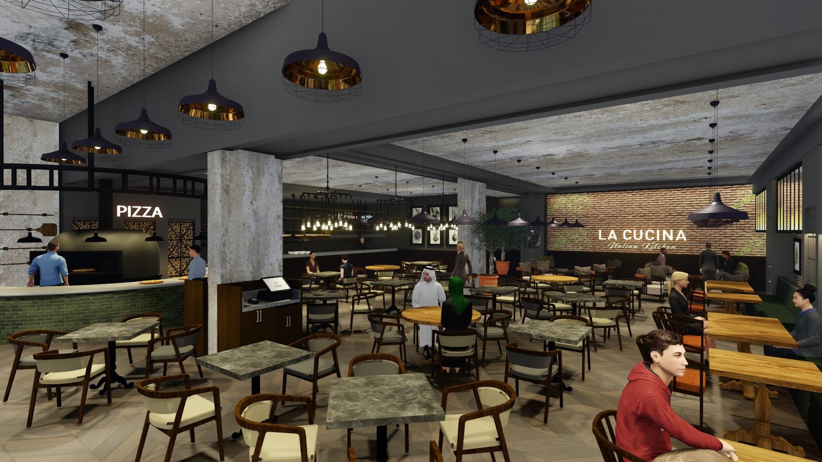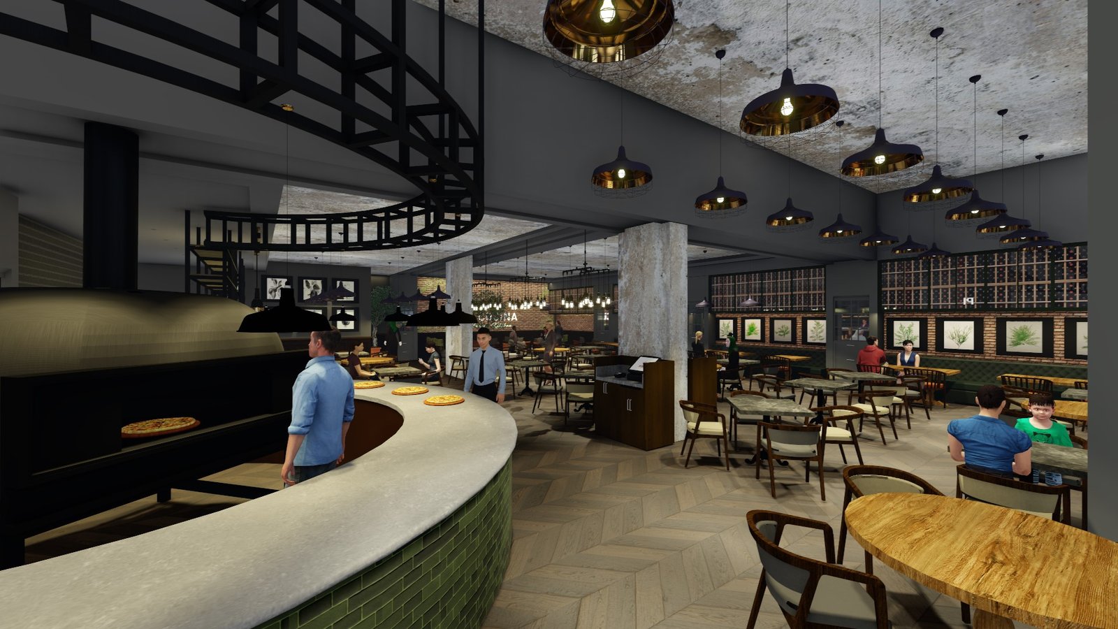 The restaurant is spatially designed around its open live-cooking stations, where skilled chefs craft fresh pasta, hand-stretched pizzas, and signature risottos right before guests' eyes. This theater of cooking is a defining element of the Vapiano concept, bringing culinary artistry to the forefront while enhancing guest interaction and transparency. The restaurant’s signature green-tiled pizza oven becomes a focal point within the space, evoking the warmth and authenticity of traditional Italian pizzerias.
